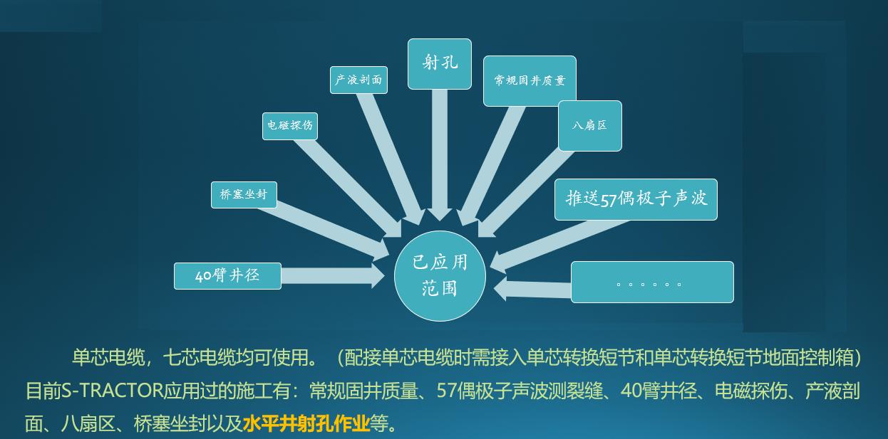爬行器负载能力强,仪器刚度好,可承受射孔冲击,附加射孔辅助工具后可用于水平井射孔作业。